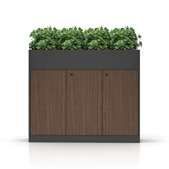 Wielofunkcyjny mebel do otwartych biur: górne koryto na rośliny oraz pojemna szafka poniżej. Zapewnia subtelną przegrodę między stanowiskami, porządkuje dokumenty i wprowadza do biura przyjazną, zieloną energię.