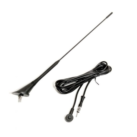 Antena dachowa z laminatu przeznaczona do odbioru sygnału radiowego w samochodzie, składająca się z pręta śrubowego, gniazda montażowego i przewodu zasilającego.