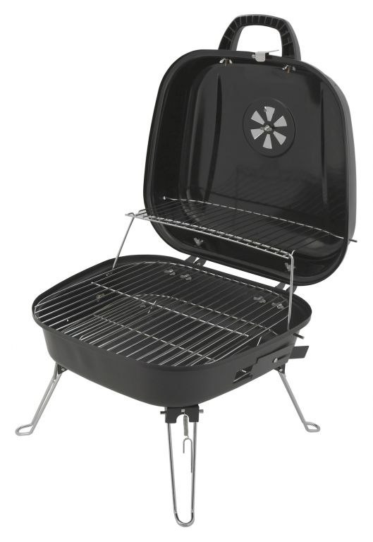 Konstrukcja wykonana jest z wysokiej jakości blachy stalowej emaliowanej na czarno. Cztery metalowe składane nogi zapewniają stabilność. Do termicznego przygotowania przysmaków grill wyposażony jest w ruszt stalowy 35 x 33 cm. Grill wyposażony jest w regulowaną wentylację na pokrywie. Miejsce na grilla jest również wyposażone w stojak do przechowywania. Aby ułatwić przenoszenie, składany grill jest zabezpieczony dźwignią i można go łatwo przenosić za pomocą uchwytu.