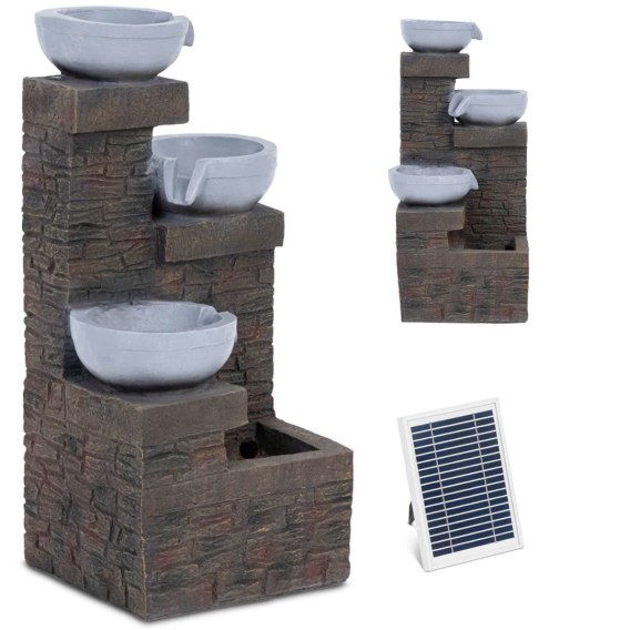 Fontanna ogrodowa marki Hillvert stworzy przyjemną atmosferę w ogrodzie. Konstrukcja z trzech mis ułożonych na ściance zasilana jest panelem słonecznym. Zasilanie fontanny energią elektryczną jest przyjazne dla środowiska. Energia przechowywana jest w wysokiej jakości baterii litowej. Wydajna pompa zapewnia przepływ wody na poziomie 300 l/godz. Przewód o długości 500 cm pozwala umieścić panel w dogodnym miejscu. Fontanna solarna ze spływającą wodą tworzy mikroklimat, który pozytywnie wpłynie na otaczającą roślinność. Oświetlenie LED zapewni nastrój w nocy. Dzięki płaskiemu tyłowi fontannę można ustawić na skraju ogrodu lub przed ścianą. Fontanna kaskadowa wykonana jest z wodoodpornej i wytrzymałej żywicy poliestrowej, dzięki czemu produkt wytrzyma każdą pogodę. Dla zapewnienia bezpiecznej pracy na zewnątrz pompa wyposażona została w stopień ochrony IPX8, a ogniwa chronione są przed bryzgami wody dzięki klasie ochrony IP44.