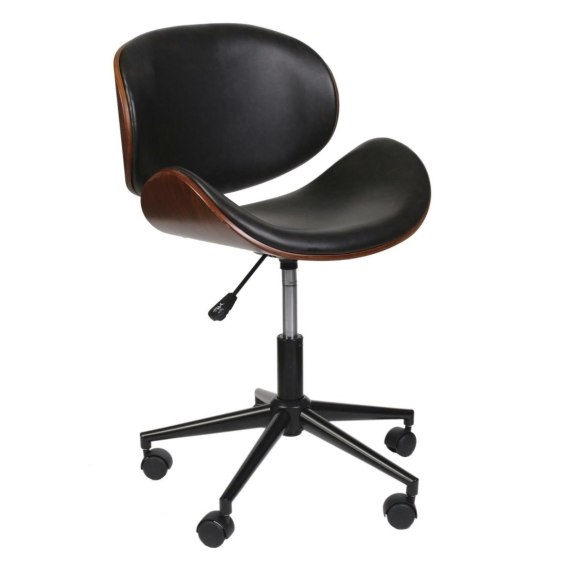 Nowoczesny i zarazem szykowny fotel biurowy oczaruje każdego użytkownika. Fotel Reno to ciekawe połączenie wygiętej sklejki z topoli oraz czarnej skóry ekologicznej. Dwie muszle ze sklejki połączone ze sobą zostały za pomocą metalowego, płaskiego wspornika. Fotel o regulowanej wysokości umieszczony został na metalowej podstawie. Pięć kółek pozwala na delikatnym przesuwaniu fotela. Regulacja wysokości pozwoli na dopasowaniu jej idealnie pod użytkownika. Wymiary pakowania: 57,5x27,5x57,5 cm Wysokość:77-89 Szerokość: 51 Głębokość: 51,5 Wysokość siedziska: 42-54