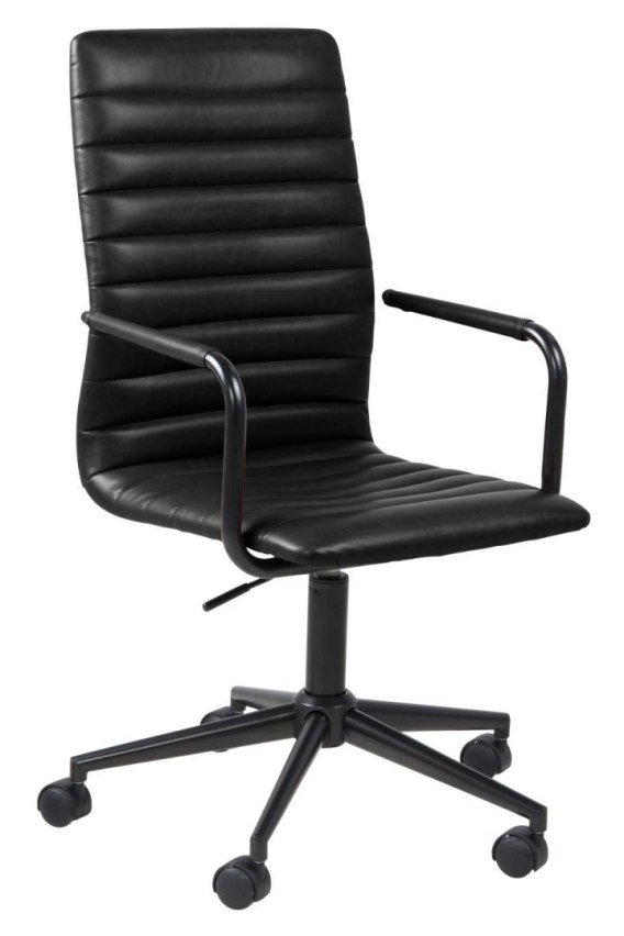 Fotel biurowy Winslow to wygodny obrotowy fotel z podłokietnikami. Siedzisko oraz oparcie krzesła zostało obite miękką czarną skórą. Poziome regularne przeszycia na fotelu dodają mu nowoczesnego wyglądu. Podłokietniki fotela również zostały obite skórą. Chromowana podstawa fotela wyposażona została w pięć obrotowych kółek. Fotel posiada regulację wysokości. Fotel posiada opcję automatycznego blokowania się kółek. Opcja ta polega, iż w momencie, gdy na fotelu nikt nie siedzi, utrudnione jest przesunięcie fotela, natomiast w momencie, gdy na nim siedzimy kółeczka obracają się delikatnie i płynnie.