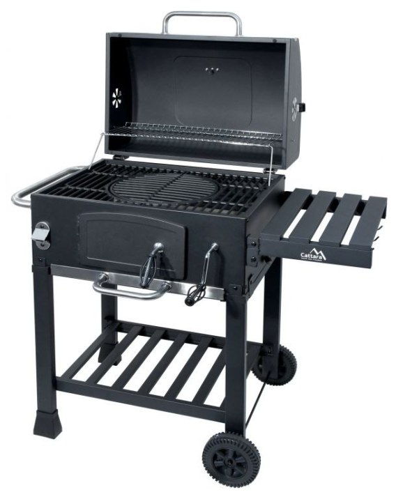 Grill na węgiel drzewny, który jest wyposażony w solidną konstrukcję, jest dostępny w pięknym czarnym kolorze. Uchwyty mają odpowiedni kształt, a koła ułatwiają poruszanie się po ogrodzie.