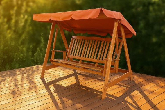 Huśtawka ogrodowa z lakierowanego drewna sosnowego + pomarańczowy dach. Doskonałe wykonanie oraz zastosowane złączki zapewniają długotrwałą funkcjonalność i wytrzymałość produktu Certyfikat FSC - gwarantuje jakość materiału.