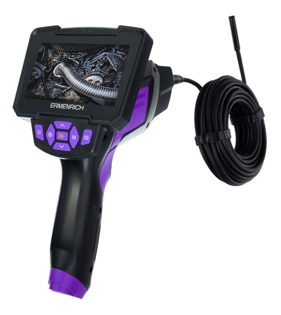Boroskop Ermenrich Seek VE70 jest wyposażony w dwie kamery HD umożliwiające prowadzenie dokładnych inspekcji wąskich i trudno dostępnych miejsc. Kamera jest zamontowana na 10 metrowym elastycznym przewodzie umożliwiający dotarcie do odległych miejsc, a oświetlenie LED ułatwia pracę w warunkach słabego oświetlenia. Kamera inspekcyjna służy do sprawdzania rur kanalizacyjnych, przestrzeni w ścianach, samochodów ciężarowych, urządzeń domowych, silników, turbin itp. Urządzenie jest przydatne zarówno dla majsterkowiczów, jak i profesjonalistów.