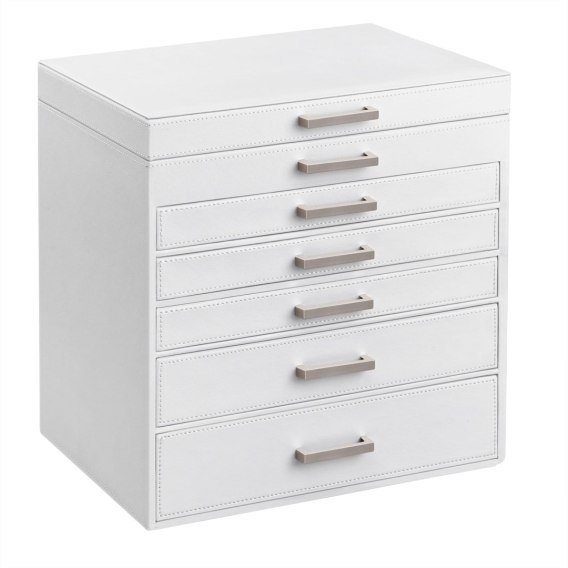 Kasetka na biżuterię, zegarki, okulary oraz inne cenne przedmioty. Bardzo elegancka i praktyczna szkatułka z elementami w kolorze srebra wpasuje się w każdy wystrój, będzie również stanowiła idealny i trafiony prezent dla każdej kobiety.