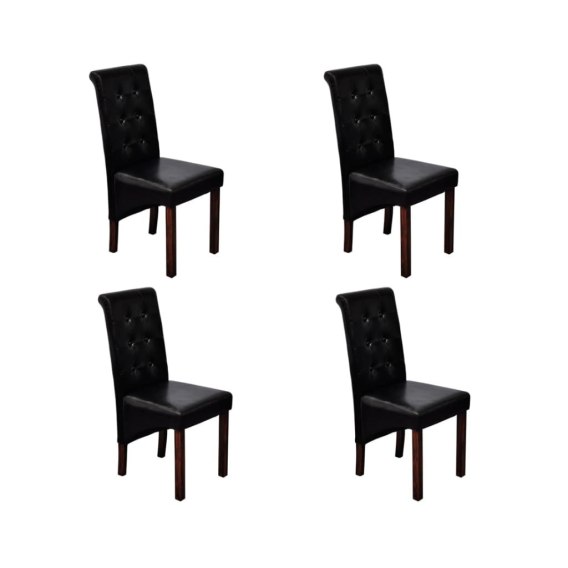 Zestaw 4 wygodnych i dużych, stylizowanych na antyczne krzeseł do jadalni ma ergonomicznie ukształtowane siedziska i oparcia. Nogi wykonane są z litego, lakierowanego drewna w ciemnobrązowym kolorze, a kanty zaokrąglono dla zwiększenia bezpieczeństwa. Krzesła są łatwe w konserwacji i czyszczeniu. Siedziska i oparcia zostały wyłożone trwałą, sztuczną skórą.