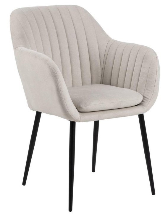 Krzesło Emilia to niezwykle efektowny mebel, który nawiązuje do stylu skandynawskiego. Tapicerowane siedzisko wykonane z tkaniny Enjoy fabric sand 1posiada efektowne pionowe pikowanie na oparciu. Podstawa wykonana z lakierowanego metalu, prezentuje się perfekcyjnie.
