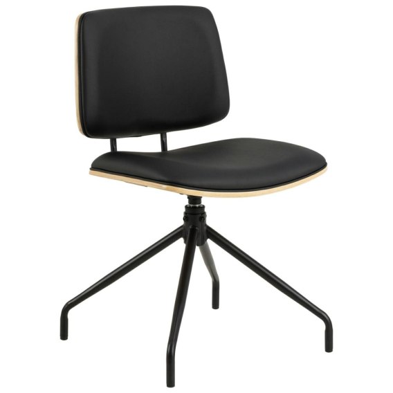 Zainspirowane nowoczesnym stylem z połowy ubiegłego wieku, to krzesło do jadalni jest równie klasyczne. Połączone dwiema czarnymi rurkami, siedzisko i oparcie wykonane są z giętego dębowego forniru lakierowanego dla uzyskania ciepłego wrażenia. Warstwa pianki i czarna sztuczna skóra zwiększają komfort, a czarna 4-gwiazdkowa podstawa z funkcją obrotową umożliwia łatwe poruszanie się.