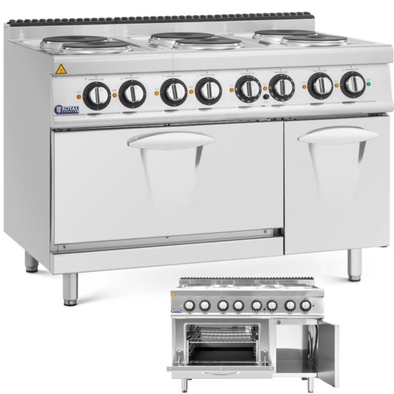 Kuchenka elektryczna z piekarnikiem z serii Pro 730 marki Royal Catering to połączenie funkcjonalnego designu i innowacyjnej technologi. Wykonana została z wytrzymałej stali nierdzewnej, łatwo można ją dopasować do większości mebli kuchennych dzięki standardowej wysokości 90 cm i głębokości 73 cm. Nóżki są regulowane aby uzyskać lepszą stabilność. Metalowe wgłębienie w drzwiach piekarnika zachwyca swoją wydajnością i sprawia, że nie potrzeba silikonowej uszczelki. Ta przemyślana konstrukcja zapewnia optymalne użytkowanie i trwałość przy jednoczesnym spełnieniu wymagań estetycznych. Kuchenka szybko nagrzewa 6 żeliwnych palników o mocy 2,6 kW każdy. Poziom grzania ustawiany jest na 1 z 3 poziomów, a kontrolki dodatkową ułatwią obsługę. Każdy palnik uniesie maksymalnie do 10 kg. Osłona przeciwrozpryskowa utrzymuje otoczenie w czystości podczas gotowania. Oddzielnie ustawiana jest górna i dolna grzałka w zakresie od 50 do 300°C za pomocą dwóch pokręteł. Urządzenie posiada też schowek z drzwiczkami, który pozwala przechować niezbędne przybory kuchenne. Kuchenka elektryczna z piekarnikiem z szafką dolną należy do seriiPro 730 marki Royal Catering i dzięki głębokości 73 cm jest kompatybilna z wieloma innymi urządzeniami kuchennymi z tej serii. Posiada również dużą komorę pieczenia o wymiarach 57,3 x 64 x 30,5 cm. Wnętrze można wygodnie podzielić za pomocą trzech rusztów. Zintegrowane zabezpieczenie przed przegrzaniem zapewnia bezpieczeństwo poprzez automatyczne wyłączenie urządzenia w przypadku nadmiernego nagrzania. Palniki i piekarnik zasilane są napięciem 400 V. Przewód zasilający dostarczany jest bez wtyczki.