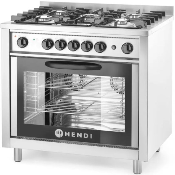 Profesjonalna kuchenka gazowa marki Hendi z serii Kitchen Line. Urządzenie wyposażone jest w 5 palników gazowych, 3 duże 3 kW, 1 mały 1,8 kW, 1 palnik wok 3,5 kW i piec konwekcyjny. Piekarnik przystosowany został do użycia 4 pojemników lub rusztów o rozmiarze GN 1/1. Posiada dodatkowy górny element grzewczy o mocy 2,5 kW umożliwiający grillowanie potraw. Komora jest oświetlona aby zwiększyć komfort użytkowania.
