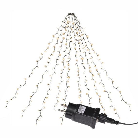 Praktyczny łańcuch w kształcie stożka z 280 diodami LED w ciepłej białej barwie, rozłożony na 8 pasmach po 2 metry, idealny do dekoracji choinek o wysokości do 2 m. Kabel zasilający ma długość około 5 m. Doskonały do użytku wewnętrznego i zewnętrznego. Wystarczy nałożyć pierścień na czubek choinki, a poszczególne pasma można elastycznie umieścić w dowolnym miejscu na drzewku. Montaż oświetlenia choinki zajmie tylko chwilę. Diod LED rozmieszczonych w odległości około 9 cm, oferujących 8 różnych funkcji świetlnych. Idealny do dekorowania ogrodów, tarasów, balkonów, drzew, krzewów oraz do tworzenia atmosferycznego oświetlenia w domu, na imprezach, weselach, urodzinach, Bożym Narodzeniu i innych uroczystościach. Może również służyć jako dekoracja na ścianach, oknach, półkach i drzwiach.