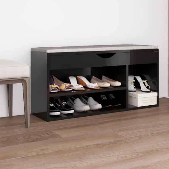 Ławka na buty z poduszką, wysoki połysk, czarna, 104x30x49 cm