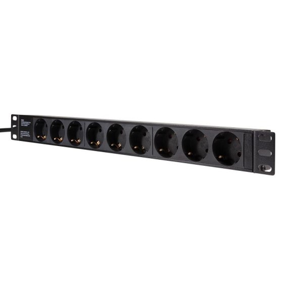 Informacje dodatkowe: 19" PDU z 9 gniazdami bez przełącznika ON/OFF, Gniazda: 9x DIN 49440, nachylone pod kątem 45°, zgodne z VDE06201, Przewód zasilający H05VVF 3x 1,5 mm2 z wtyczką CEE7/7, Profil: powłoka ze stopu aluminium, Materiał: ognioodporny polipropylen, Znamionowe napięcie wejściowe: 250 V AC, 50/60 Hz, Maksymalny prąd wejściowy: 16A, Wymiary: 1U, 482 x 45 x 45mm