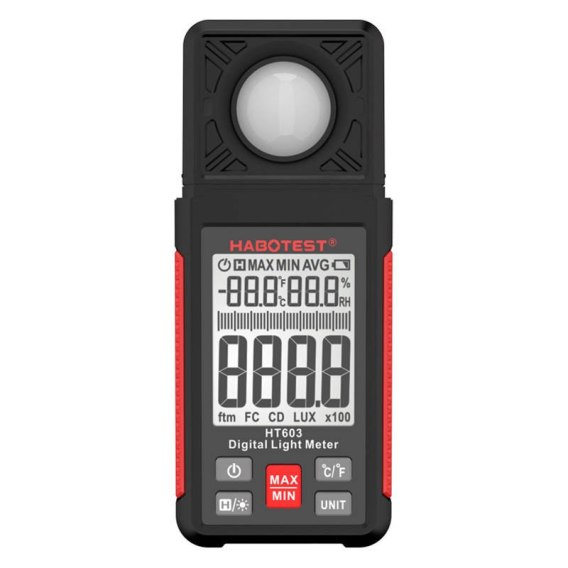 Habotest HT603 służy do mierzenia natężenia światła w zakresie 0~100000 LUX / 0~10000 FC. Sprawdzi się w takich dziedzinach jak przemysł elektryczny lub do celów inspekcyjnych pomieszczeń. Wyróżnia się krótkim czasem reakcji, a obrotowa sonda zwiększa wygodę użytkowania. Co więcej, za pomocą urządzenia możesz również zmierzyć poziom wilgotności otoczenia oraz temperaturę. Dodatkowo HT603 zasilają 3 baterie AAA.