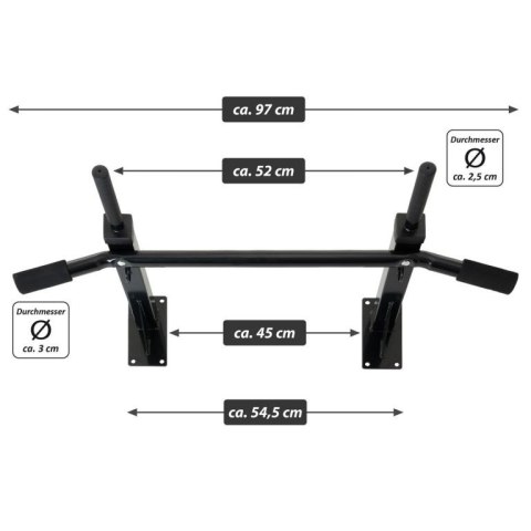Drążek do montażu na ścianie, jest idealnym produktem do codziennego treningu w domu, w studio lub podczas rehabilitacji. Cztery różne szerokości chwytu umożliwiają zróżnicowany i złożony trening pleców. Możesz trzymać ten pręt w szerokiej, równoległej lub wąskiej pozycji. Optymalne urządzenie wzmacniające, które nadaje się szczególnie do wzmacniania mięśni ramion, brzucha i pleców. Wyściełane uchwyty zapewniają pewny i antypoślizgowy chwyt oraz zapobiegają powstawaniu pęcherzy na dłoniach. Bardzo mocna konstrukcja i mocne połączenia śrubowe zapewniają stabilne mocowanie. W przeciwieństwie do tradycyjnego drążka balastowego, który wsuwa się w ościeżnicę, Twoje ruchy nie są ograniczone. Aby zapewnić maksymalną stabilność i bezpieczeństwo, drążek należy mocować tylko do litych ścian. Do montażu najlepiej nadają się ściany betonowe i kamienne.