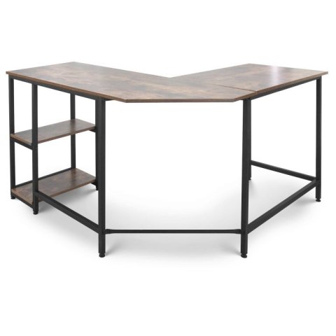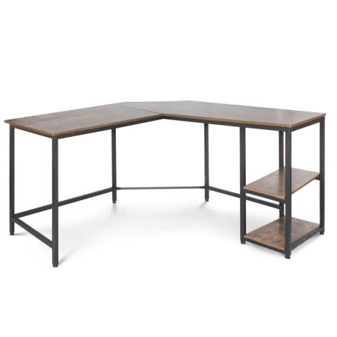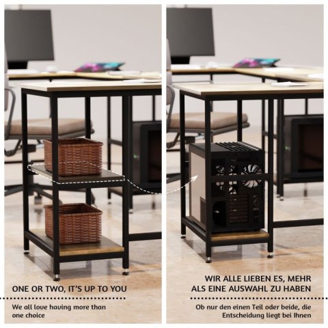 To biurko komputerowe łączy w sobie odważną elegancję metalowego stelaża z naturalnym urokiem rustykalnej brązowej deski przypominającej drewno i jest idealnym połączeniem estetyki i funkcjonalności. Nasze uniwersalne biurko ma dwie pojemne powierzchnie robocze, dwie boczne półki i praktyczną wnękę w rogu, w której możesz przechowywać wszystkie kable poza zasięgiem wzroku. Biurko narożne ma duże wymiary, dzięki czemu z łatwością pomieścisz na nim swój komputer oraz wszystkie powiązane z nim urządzenia i akcesoria i utrzymasz je w porządku.