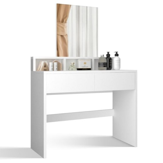 Ta toaletka ma przestronny blat z lustrem, 2 szuflady i 3 otwarte przegrody, które zapewniają dużo miejsca na wszystkie niezbędne kosmetyki.