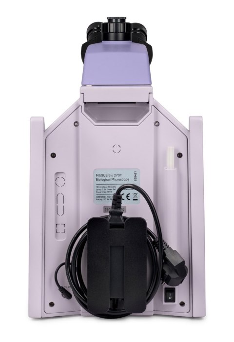 Konstrukcja pozwala na schowanie zasilacza i przewodu zasilającego, co poprawia estetykę miejsca pracy i bezpieczeństwo przenoszenia mikroskopu, a także upraszcza przechowywanie urządzenia.