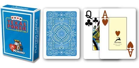 Jakościowe karty do pokera ze 100% plastiku popularnej marki Modiano. Karty są w klasycznym formacie prostokątnym, są 8,89 cm wysokie i 6,35 cm szerokie. Karty mają indeksy w 2 rogach gdzie jest oznaczony nominał karty. Karty Modiano są bardzo popularne wśród graczy ze względu na wysoką wytrzymałość. Dzięki temu, że są wyprodukowane ze 100% plastiku wytrzymają 100 razy więcej gier od kart papierowych albo tych powlekanych tworzywem sztucznym. Karty są zmywalne, wodoodporne i słynne swoją długotrwałością.