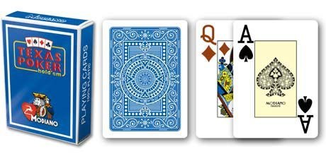 Jakościowe karty do pokera ze 100% plastiku popularnej marki Modiano. Karty są w klasycznym formacie prostokątnym, są 8,89 cm wysokie i 6,35 cm szerokie. Karty mają indeksy w 2 rogach gdzie jest oznaczony nominał karty. Karty Modiano są bardzo popularne wśród graczy ze względu na wysoką wytrzymałość. Dzięki temu, że są wyprodukowane ze 100% plastiku wytrzymają 100 razy więcej gier od kart papierowych albo tych powlekanych tworzywem sztucznym. Karty są zmywalne, wodoodporne i słynne swoją długotrwałością.