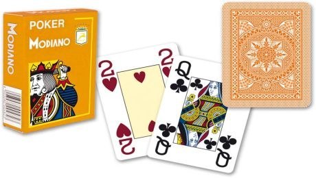 Jakościowe karty do pokera ze 100% plastiku popularnej marki Modiano. Karty mają klasyczny kształt prostokąta, są 8,89 cm wysokie a 6,35 cm szerokie. Karty są czwororożne - to znaczy,że są w każdym rogu oznaczone nominałem. Karty Modiano są bardzo popularne wśród graczy grających w pokera regularnie ze względu na swą wytrzymałość. Dzięki temu,że składają się ze 100% plastiku wytrzymują 100 razy więcej gier od kart papierowych albo tych powlekanych tylko plastikiem. Karty są zmywalne, wodoodporne i znane ze swej wytrzymałości.