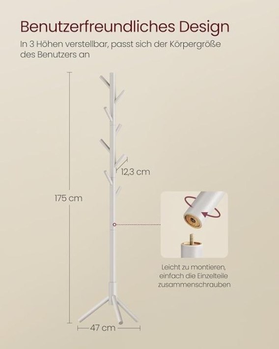 Wykonany z litego drewna kauczukowego, wieszak jest wytrzymały i stabilny. Regulacja wysokości pozwala dopasować go do potrzeb domowników. Montaż jest szybki i prosty - nie wymaga narzędzi. Szeroka podstawa zapewnia bezpieczeństwo nawet przy dużym obciążeniu.
