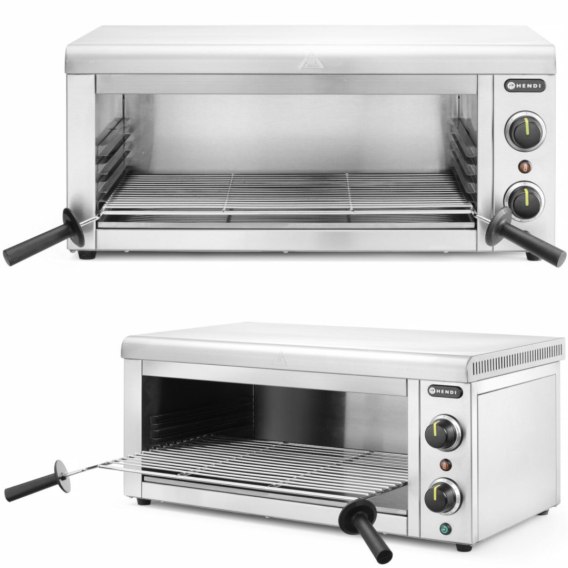 Opiekacz GN 1/1 firmy HENDI jest idealny do szybkiego podgrzewania i grillowania przekąsek. Wysokość rusztu może być regulowana na 4 poziomach. Opiekacz posiada w zestawie demontowaną tackę na okruchy dla łatwego czyszczenia oraz ruszt. Łatwy montaż na ścianie nie wymaga dodatkowych uchwytów dla zaoszczędzenia miejsca w kuchni. Płynna, bezstopniowa regulacja zapewnia precyzyjne ustawienie parametrów podgrzewania. Opiekacz wyposażony został w termostat, timer do 30 min oraz lampkę kontrolną. W komorze urządzenia jest możliwość umieszczenia tacy GN 1/1 (brak w zestawie).