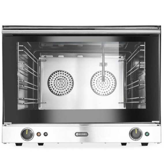 Piec konwekcyjny H100 HENDI to solidne urządzenie wykonane ze stali nierdzewnej z emaliowanym wnętrzem. Podwójne wentylatory i grzałki zapewniają równomierne rozprowadzenie ciepła, co poprawia efekty gotowania i skraca czas przygotowania potraw. Drzwi z nienagrzewająca się szybą z podwójnym przeszkleniem można wyjąć w celu łatwego czyszczenia. Piec posiada wewnętrzne oświetlenie oraz miejsce na 4 tace GN 1/1 z odstępem 75 mm między prowadnicami. Tylne przyłącze wody oraz 120-minutowy timer wspierają płynną pracę w kuchniach o dużym natężeniu pracy.