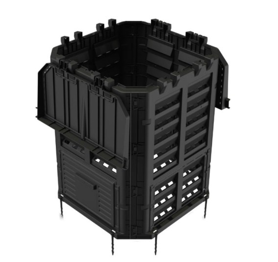 Plastikowy kompostownik o pojemności 300 l wykonany z polipropylenu o wysokiej wytrzymałości. Konstrukcja zapewnia cyrkulację powietrza i przyspiesza proces rozkładu. Produkt posiada pokrywę i boczne drzwiczki ułatwiające wyjmowanie kompostu. Kompostownik jest odporny na warunki atmosferyczne, promieniowanie UV i może być przechowywany na zewnątrz w każdych warunkach pogodowych od -30°C do 45°C. Montaż jest bardzo prosty i nie wymaga użycia narzędzi dzięki systemowi CLICK. Wykonany z materiału pochodzącego z recyklingu. Zalety kompostownika.