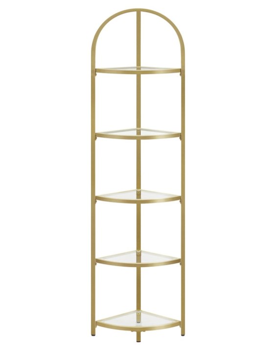 Regał wykonany ze szkła i stali malowanej proszkowo na kolor złoty. Produkt tworzy niesamowitą dekorację Twojego pomieszczenia, dzięki łukowemu designowi. Półki regału są stabilne, a więc możemy umieścić na nich książki, kwiaty w wazonach, ozdobne figurki, dziecięce zabawki oraz ramki ze zdjęciami. Nowoczesny, luksusowy a zarazem ciekawy wygląd regału, te cechy na pewno skłonią Cię do wyboru tego mebla. Regał cechuje się uniwersalnością oraz funkcjonalnością, będzie świetnie pasował do salonu, sypialni, łazienki, domowego gabinetu, kuchni, a 5 półek ułatwi nam dostęp do ulubionych rzeczy. Regał na pewno wpasuje się w wystrój niejednego pomieszczenia. Matowa rama z mieniącymi się drobinkami daje niesamowity efekt. Stalowa konstrukcja zapewnia stabilność mebla. Idealnie spasowane elementy ramy oraz szklane półki nadadzą Twojemu wnętrzu wdzięku. Zadbaj o estetykę swojego salonu, pokoju, kuchni czy sypialni wybierając produkty sprawdzone, o najwyższej jakości wykonania.