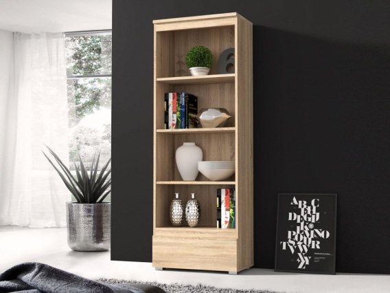 Nowoczesny, pojemny regał łączący minimalistyczny design z praktycznością. Wyposażony został w cztery otwarte półki, które pomieszczą książki, segregatory, dekoracje czy akcesoria biurowe, a także w głęboką, wysuwaną szufladę na drobiazgi i dokumenty.