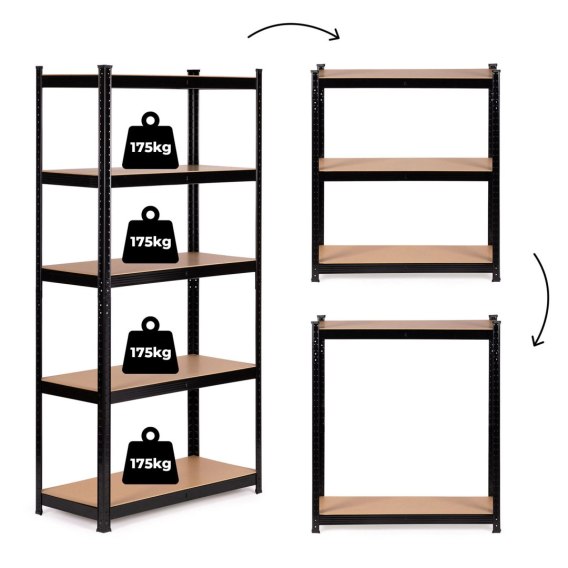 Regał wyposażono w 5 solidnych półek, które możesz swobodnie montować na dowolnej wysokości, dopasowując ich układ do własnych potrzeb. Każda z półek wytrzymuje obciążenie do 175 kg, co łącznie daje imponującą nośność aż 875 kg. Stabilność całej konstrukcji wzmacnia dodatkowy łącznik umieszczony centralnie pod każdą półką, który zapewnia odpowiednią sztywność i bezpieczeństwo przechowywania. Półki wykonano z trwałej płyty MDF, odpornej na uszkodzenia mechaniczne, ścieranie oraz nacisk, co gwarantuje długotrwałe i bezproblemowe użytkowanie.