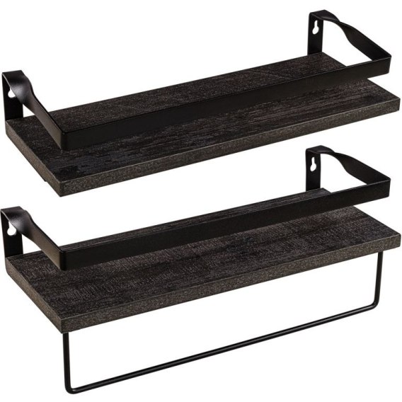 Zestaw 2 sztuk półek ściennych z serii designerskiej „VOLATO DUO" to prawdziwa perła dla Twojego domu. Nie tylko dzięki rustykalnemu wyglądowi drewna w atrakcyjnym wzornictwie, ale także dzięki dekoracyjnym okuciom. Metalowa rama nie tylko umożliwia stabilne mocowanie do ściany, ale także zapobiega wypadaniu jakichkolwiek przedmiotów z półki. W zestawie znajduje się również opcjonalny metalowy uchwyt, który z przyjemnością powiesz na ręcznik lub jako uchwyt na przybory kuchenne.
