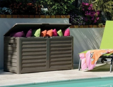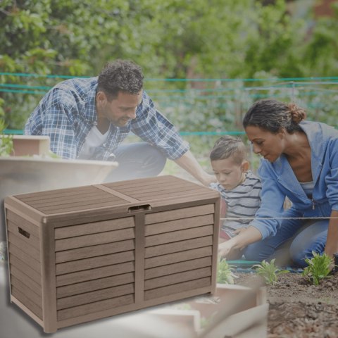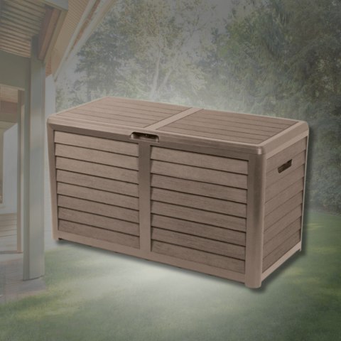 Na bokach skrzyni umieszczone wygodne uchwyty, które ułatwiają przenoszenie. Modny wzór imitujący naturalne drewno oraz piękny kolor sprawi, że będzie pasowała do każdego ogrodu i ładnie prezentowała się pośród zieleni.