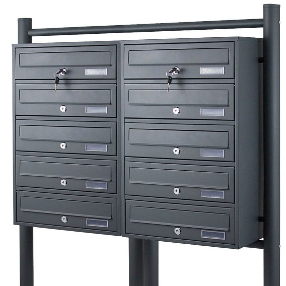 Dzięki ponadczasowej, eleganckiej konstrukcji oraz wykonaniu ze stali nierdzewnej system Euro skrzynek na listy doskonale sprawdza się w firmach oraz na osiedlach mieszkaniowych. Ze względu na zwartą konstrukcję, system letterbox 10 skrzynek zajmuje niewiele miejsca. Montaż jest w ten sposób łatwy i szybki. Zakres dostawy obejmuje materiały montażowe do betonowych fundamentów.