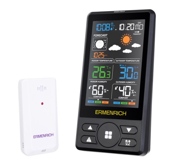 Domowa stacja meteorologiczna Ermenrich Report WR50 ma szeroki zakres funkcji, które są nieocenione w codziennym życiu. Umożliwia śledzenie zmian pogodowych na zewnątrz oraz kontrolowanie mikroklimatu w pomieszczeniach. Duży kolorowy ekran wyświetla wszystkie ważne informacje o warunkach atmosferycznych: temperaturę i wilgotność w pomieszczeniu i na zewnątrz, ciśnienie atmosferyczne, prognozę pogody i poziom komfortu. Urządzenie może również pełnić funkcję cyfrowego zegara i kalendarza (te informacje są wyświetlane w dolnej części ekranu). Można również ustawić je na szafce nocnej, gdzie będzie pełnić rolę budzika. Osoby zainteresowane astronomią lub wierzeniami ludowymi ucieszy kolejny przydatny parametr wyświetlany na ekranie: fazy Księżyca.
