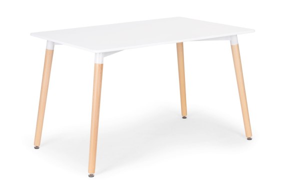 Nogi stołu wykonane są z wytrzymałego drewna sosnowego, a na ich końcach znajdują się specjalne, ruchome stopki, które pomogą w wypoziomowaniu stołu oraz pozwolą uniknąć zarysowań podłogi. Blat został zrobiony z płyty MDF pokrytej odporną okleiną w kolorze matowej bieli, pod nim znajduje się metalowy stelaż, w którym osadzone są nogi stolika.