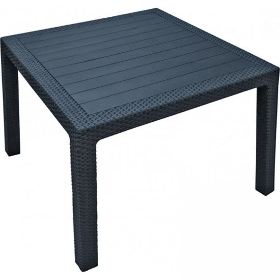 Kwadratowy plastikowy stół w kolorze antracytowym, imitacja rattanu. Łatwy w utrzymaniu czystości.