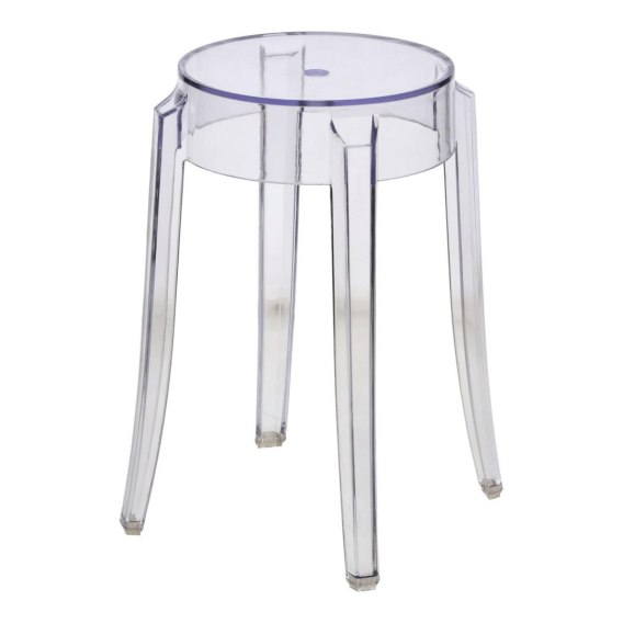 Przezroczysty stołek barowy. Nie zajmuje miejsca w przestrzeni. Jest idealnym uzupełnieniem kolekcji krzeseł transparentnych. Stołek dostępny jest również w wersji niskiej i wysokiej.Maksymalne obciążenie wynosi 120kg Średnica siedziska:26cm