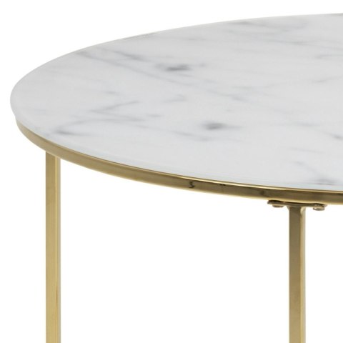 Stolik kawowy Bolton wykonany został z metalowej podstawy wykończonej w połysku w kolorze złotym oraz blatu o fakturze marmuru. Blat wykonany zostałze szkła, które posiada "zmrożone" matowe wykończenie. Marmurowy print na spodzie blatu w kolorystyce biało szarej to trend wnętrzarski, który pasuje do każdego stylu- od eklektycznego po skandynaski oraz boho. Geometryczna forma sprawia, że mebel jest wyjątkowo ustawny co doskonale łączy się ze stylem minimalistycznym. Połączenie złotej podstawy z blatem o kontrastowym kolorze wprowadzi wyjątkową atmosferę do wnętrza. Stolik wymaga montażu. Maksymalne obciążenie 30kg. Max. ilość sztuk w kartonie: 1 Wymiary kartonu: 89cm x 8,5 cm x 88cm