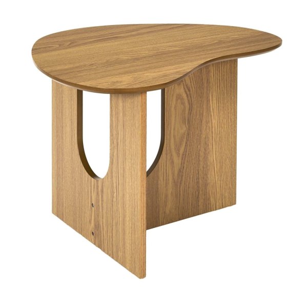 Stolik kawowy o obłych, organicznych kształtach to kwintesencja stylu japandi lub boho. Stolik o nietypowej podstawie składającej się z 2 desek będzie idealnym meblem do salonu lub poczekalni. Blat stolika o nieregularnym kształcie dodaje mu ponadczasowego wyglądu. Wymaga montażu Materiał: płyta MDF w okleinie imitującej dąb. Max. obciążenie stolika 20kg