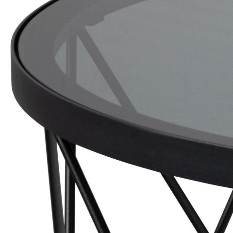 Okrągły stolik kawowy Halstow, blat wykonany z dymionego szkła hartowanego. Podstawa to matowa czarna stal malowana proszkowo. Harmonijne połączenie przydymionego szkła hartowanego i drucianej podstawy tworzy czarujący element centralny, w którym nowoczesne wyrafinowanie łączy się z artystycznym urokiem. Dzięki blatowi z przydymionego szkła jest lekki, a druciana podstawa nadaje mu uroku.