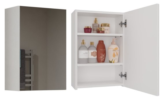 • Wyposażona w 3 praktyczne półki schowane za stylowymi drzwiczkami z lustrzanym frontem.