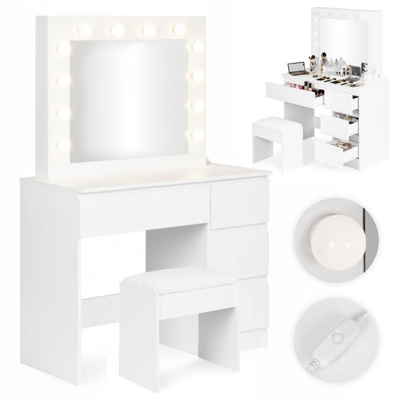 Toaletka kosmetyczna z lustrem i oświetleniem LED 4 szuflady taboret ModernHome