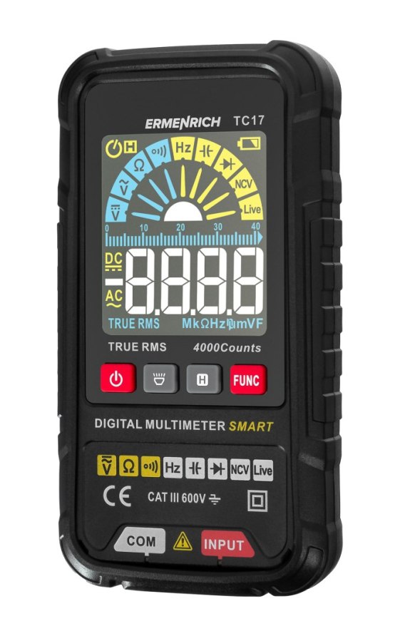 Uniwersalny miernik cyfrowy Ermenrich Zing TC17 to niewielkie i dokładne (True RMS) urządzenie pomiarowe dla techników i majsterkowiczów. Nadaje się do diagnostyki sieci elektrycznych w mieszkaniach, domach, obiektach przemysłowych, pomieszczeniach biurowych i samochodach, a także do rozwiązywania problemów z urządzeniami elektrycznymi. Uniwersalny miernik mieści się w kieszeni, dzięki czemu można go wygodnie nosić przy sobie nawet podczas pracy na dużym placu budowy.