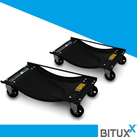 Wózki marki BITUXX umożliwiają manewrowanie pojazdami z uszkodzonym lub zablokowanym napędem. Każdy z wózków posiada 4 skrętne koła i udźwig 450kg. Idealne do zastosowania w warsztatach, podczas wystaw samochodowych i w salonach. Wózki zostały idealnie wyważone. Stalowa konstrukcja zapewnia ich długą żywotność.