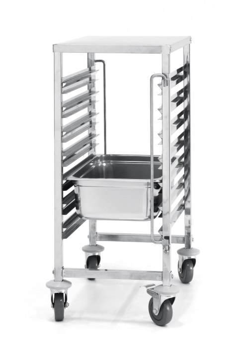 Wózek do transportu pojemników GN z 7 stanowisk o wymiarach GN 1/1 i wysokości 80 mm. Wózek wyposażony jest w zabezpieczenie przed wypadnięciem pojemników. Doskonale sprawdza się w dużej i małej gastronomii, w firmach cateringowych, szkołach czy szpitalach. Dostarczamy w płaskim opakowaniu do samodzielnego montażu.