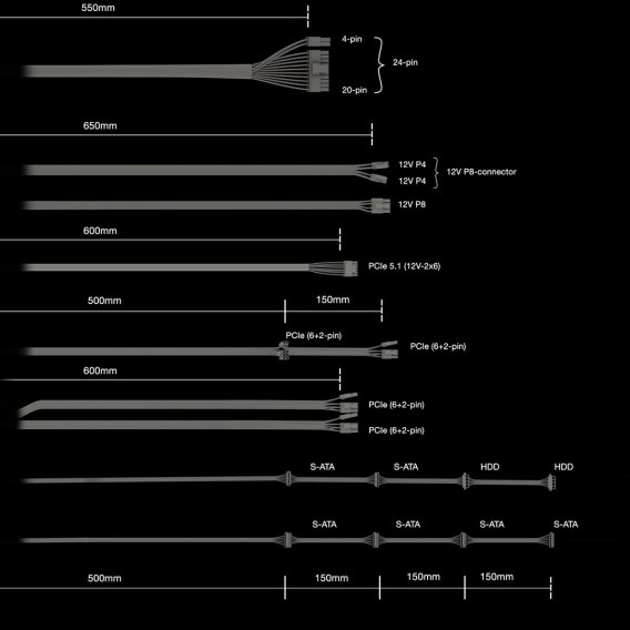 | Przewody | Prąd przemienny, Procesor, PCIe, Peripheral (Molex), SATA |