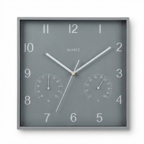 Szukasz zegara ściennego w nowoczesnym i minimalistycznym stylu z dodatkowymi funkcjami takimi jak termometr i higrometr? ZEGAR ŚCIENNY KWADRATOWY TERMOMETR I HIGROMETR 28X28CM ARTICASA SZARY będzie idealny!